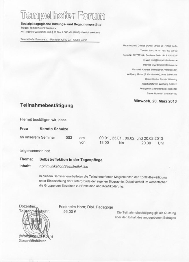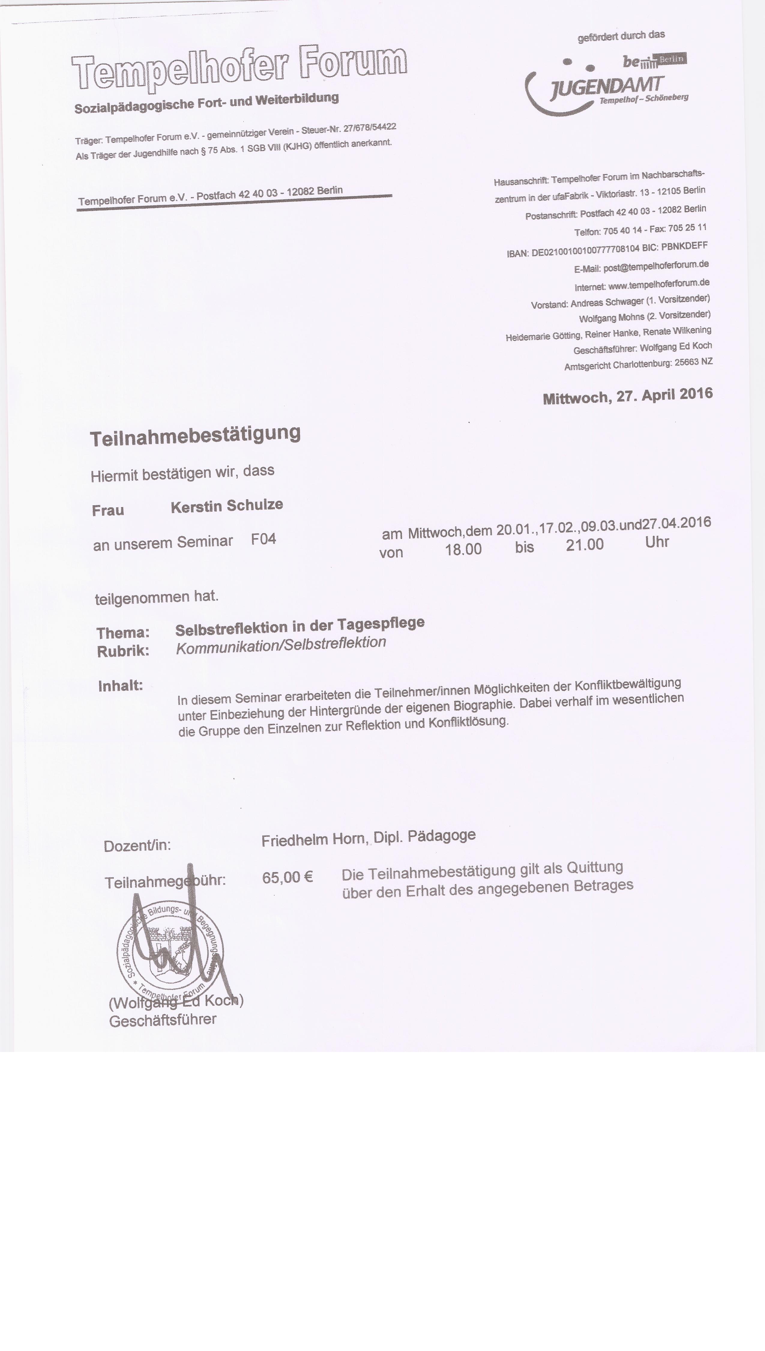 Um neue Erkenntnisse und Entwicklungen in unsere pädagogische Arbeit einfließen zu lassen, nehme ich regelmäßig an sozialpädagogischen Fortbildungskursen teil.